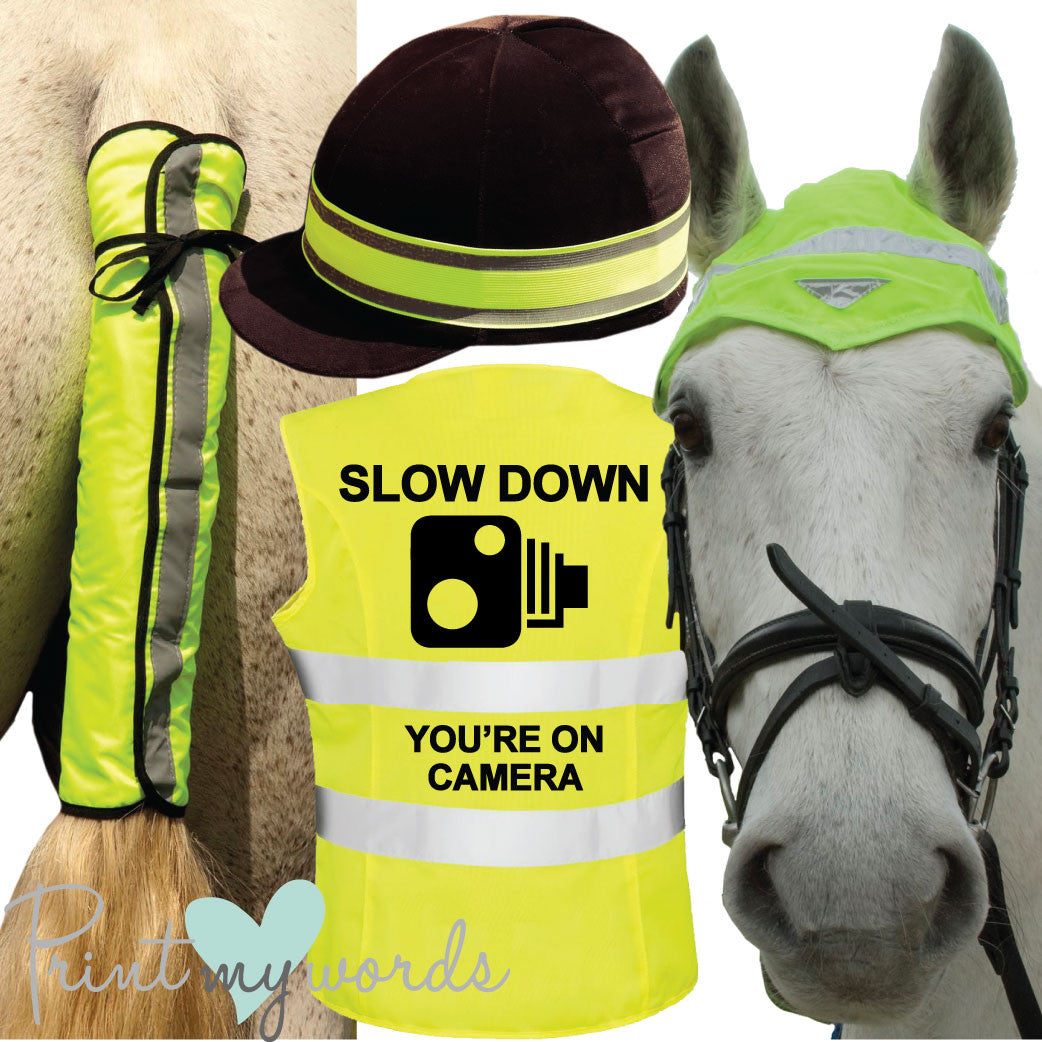 This reflective bundle will keep you visible during your hacks. The set includes a reflective tail guard, a reflective, elasticated hat band, a horse bonnet and a hi viz vest with a large warning message printed to the back.