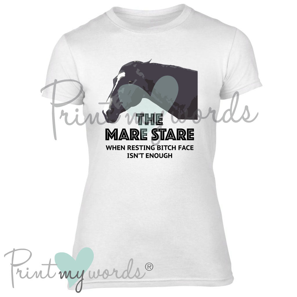 Print My Words has the best range of funny and personalised equestrian t-shirts at your fingertips. We have the most relevant and hilarious slogans professionally printed onto our supersoft tees. This Mare Stare t-shirt is a huge hit with equestrians. The slogan reads 'The mare stare, when resting bitch face isn't enough.'